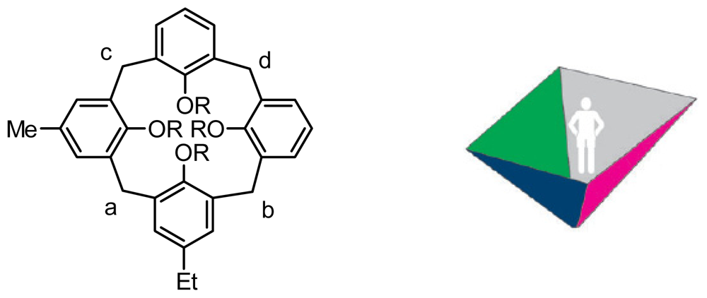 - Iwamoto, K; Shimizu, H; Araki, K; Shinkai, S. Syntheses and Optical Resolution of Calix[4]arenes with Molecular Asymmetry. Systematic Classification of All Possible Chiral Isomers Derivable from Calix[4]arene. J. Am. Chem. Soc 1993, 115, 3997–4006. [Google Scholar]