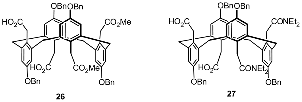 Inherently chiral calix[4]arenes in 1,3-alternate conformation with asymmetric functionalization on the lower and upper rims were presented by Gutsche et al. [38]. The authors alcoholyzed or aminated the bisanhydrides from tetrabenzyl ether, tetra-p-bromobenzenesulfonate, and tetra-p-methylbenzenesulfonate of p-carboxymethylcalix[4]arene in the 1,3-alternate conformation to yield inherently chiral calix[4]arenes carrying two carboxymethyl and two carboalkoxymethyl groups on the upper rim, or inherently chiral calix[4]arenes carrying two carboxymethyl and two amidomethyl groups on the upper rim. 26 and 27 are illustrated in Figure 11 as typical examples of these two types of inherently chiral calix[4]arenes.