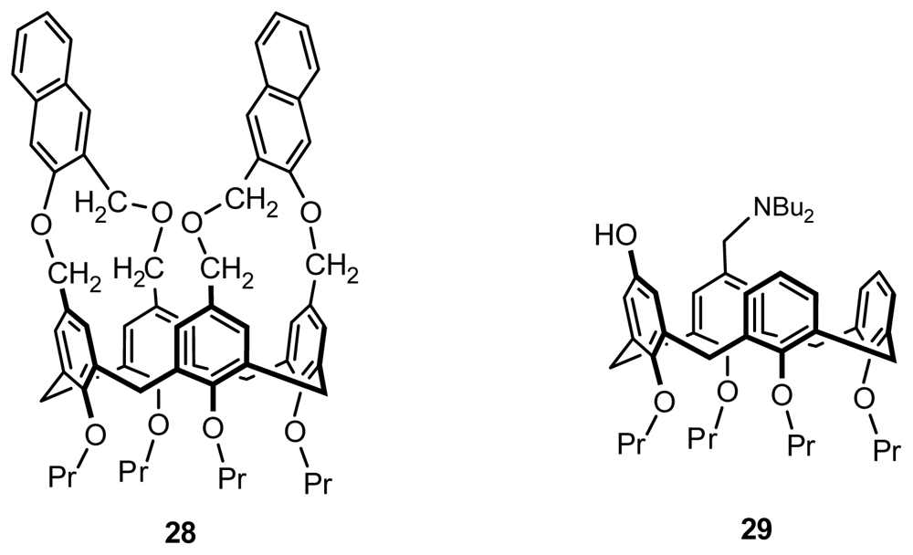 The earliest inherently chiral calix[4]arene was accidentally prepared through asymmetric functionalization on the upper rim by Gutsche et al. in 1982, which was a prelude to the study of inherently chiral calixarenes, although its conformation was not identified [15]. After a few years, Shinkai reported that a cross-link reaction between p-chloromethylcalix[4]arene tetrapropyl ether and 3-hydroxymethyl-2-naphthol in the presence of base resulted in a syn isomer and anti isomer 28 (Figure 12), the latter one classified as an inherently chiral calix[4]arene [39]. Another typical inherently chiral calix[4]arene 29 (Figure 12) in cone conformation asymmetrically functionalized on the upper rim was synthesized from proximally p-dibrominated tetra-O-propylcalix[4]arene by Shimizu [40]. Subsequently, they prepared a series of similar entities and studied their properties.