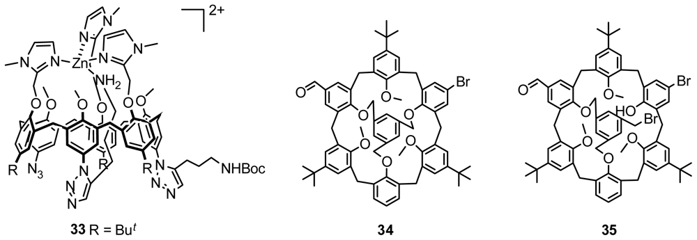 Asymmetric functionalization of calix[6]arene on the upper rim is another method to produce inherently chiral calix[6]arene. Reinaud demonstrated an interesting and novel inherently chiral calix[6]arene 33 (Figure 14) in cone conformation, which was prepared with an efficient method for the controlled, stepwise functionalization of calix[6]arene on the upper rim associated with metal-template and molecular inclusion [42]. Moreover, we recently developed an efficient route to synthesize inherently chiral calix[6]arene 34 and its intermediate 35 (Figure 14) in cone conformation from selective formylation and bromination of 1,3,5-bridged calix[6]arene with a mesitylenyl group on the upper rim [43].