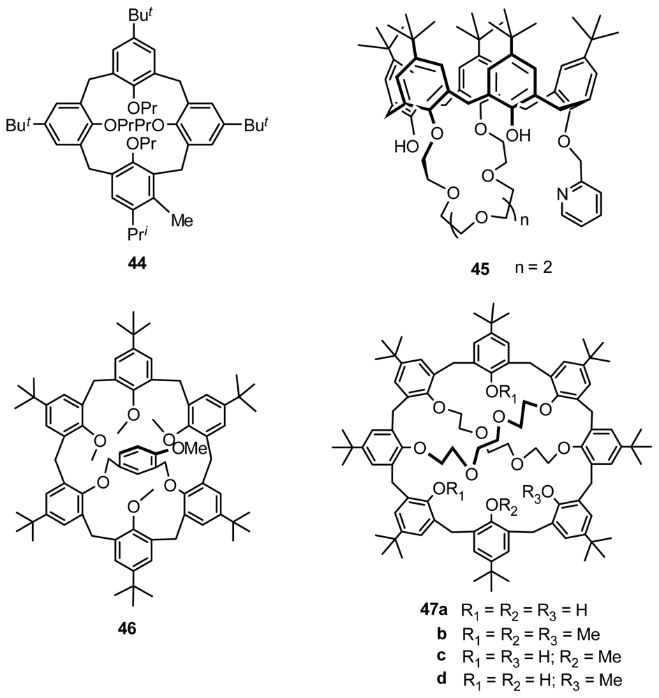 Compared with inherently chiral calix[4]arenes, larger inherently chiral calixarenes are rarely optically resolved by HPLC with a chiral column. Pappalardo successfully resolved inherently chiral calix[5]arene 1,2-crown ether 15 and inherently chiral calix[5]arene 1,3-crown ether 45 (Figure 16) by HPLC with a Chiralpak AD column and Chiralcel OD column [52]. To find definitive evidence for the immobilization of the calix[6]arene ring, Shinkai synthesized inherently chiral calix[6]arene 46 (Figure 16), the 1,3-phenyl units of which are bridged by an asymmetric 4-methoxy-m-xylenyl unit, and optically resolved it by an HPLC method with a chiral packed column [53]. Neri and Caccamese resolved 1,4-2,5-calix[8]bis-crown-4 and its methyl derivative 47 (Figure 16) by HPLC with a Chiralpak AD column and Chiralcel OD column [54].
