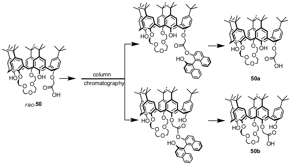 Flash column chromatography was also successfully applied to resolve inherently chiral calix[5]arenes. Huang and Chen obtained a pair of enantiopure inherently chiral calix[5]arenes, 50a and 50b (Figure 18), which were prepared by separation of their diastereomers formed with R-BINOL and their racemates by column chromatography instead of HPLC and hydrolysis of the diastereomers [58].
