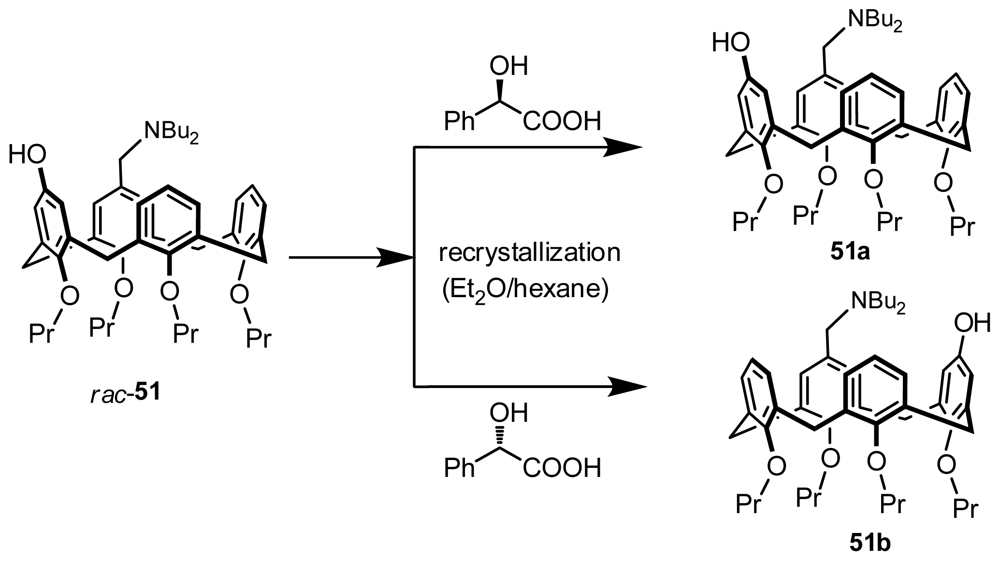 Inherently chiral calixarenes could be directly optically resolved from recrystallization of diastereomeric complexation without covalent bonding with chiral auxiliaries. Until now, only one example of an inherently chiral calix[4]arene has been optically resolved with this method, although it is popular in the optical resolution of other chiral molecules. Shimizu first prepared a pair of enantiomeric inherently chiral calix[4]arenes, 51a and 51b (Figure 19), by recrystallization after complexation between their racemate 51 and chiral mandelic acid in the Et2O and hexane mixture [40].