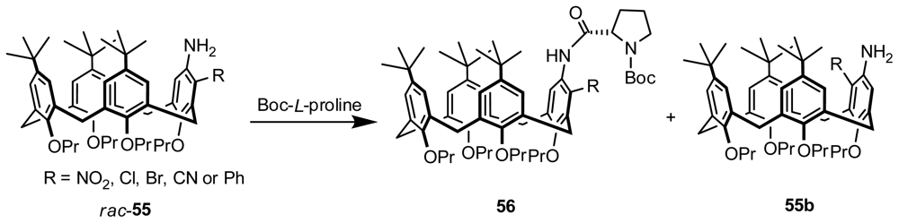 An example of an effective kinetic resolution of racemic inherently chiral calix[4]arene was reported by Huang and Chen (Figure 21). Racemic m-nitro-substituted inherently chiral aminocalix[4]arene 55 (R = NO2) was transformed into a mixture of the corresponding amide 56 (R = NO2) and the remaining aminocalix[4]arene 55b (R = NO2) when acylated with Boc-l-proline, which revealed the occurrence of nonenzymatic kinetic resolution. The influences of the ratio of acylating reagent to substrate, reaction time, and solvent on the resolution process were exhaustively studied [61].
