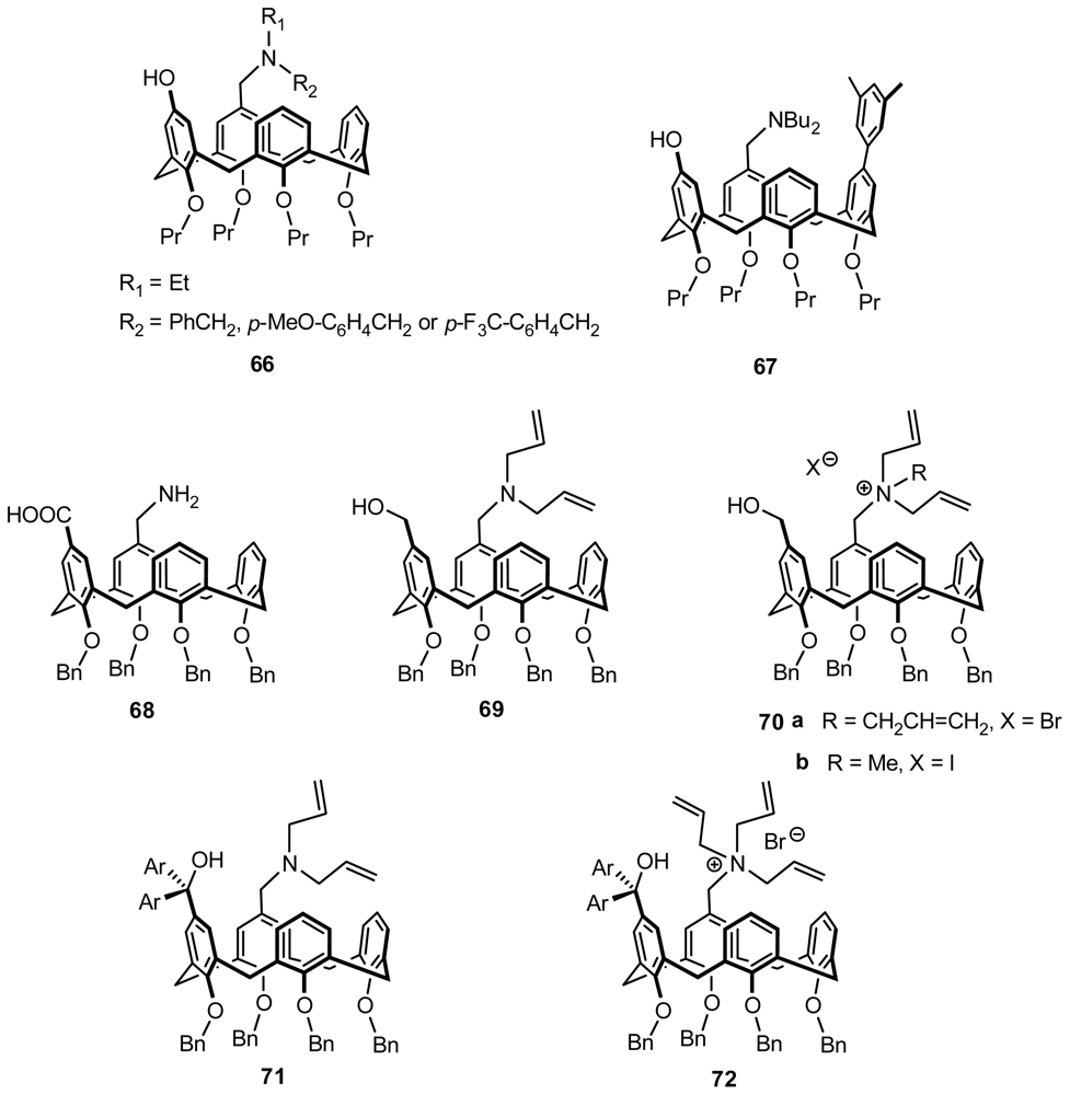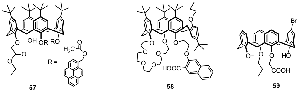 The first example of the chiral recognition of inherently chiral calixarene was reported by Jin [63]. The fluorescence properties of two enantiomeric antipodes of tri-O-alkylated fluorescent chiral calix[4]arene 57 (Figure 22) with two pyrene moieties forming an intramolecular pyrene excimer towards three chiral guests were examined in CHCl3–EtOH (30:1) at 25 °C. The intensity of the excimer emission of 57 (3.9 μmol·dm−3) increased up to two-fold with the addition of L-phenylalanine methyl ester, l-alanine methyl ester, or l-phenylglycinol in the presence of Na+ (76 μmol·dm−3). However, differences in the fluorescence intensities between the two isomers of 57 in the presence of the chiral guests were too small for evaluating their chiral discriminating ability.