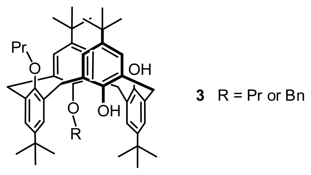 All possible chiral isomers that can be derived from calix[4]arene by modification of the OH groups were systematically classified by Shinkai [21]. The numbers of chiral isomers are 24 for tetra-Osubstituted calix[4]arenes, 10 for tri-O-substituted calix[4]arenes, 3 for di-O-substituted calix[4]arenes, and 0 for mono-O-substituted calix[4]arenes. To demonstrate asymmetry in these chiral calix[4]arenes, they synthesized several tetra-, tri-, and di-O-substituted calix[4]arenes, in which 3 (Figure 3) comprises the first di-O-substituted inherently chiral calix[4]arene in 1,3-alternate conformation, and 4 and 5 (Figure 4) are the first two tri-O-substituted entities in partial cone conformation.