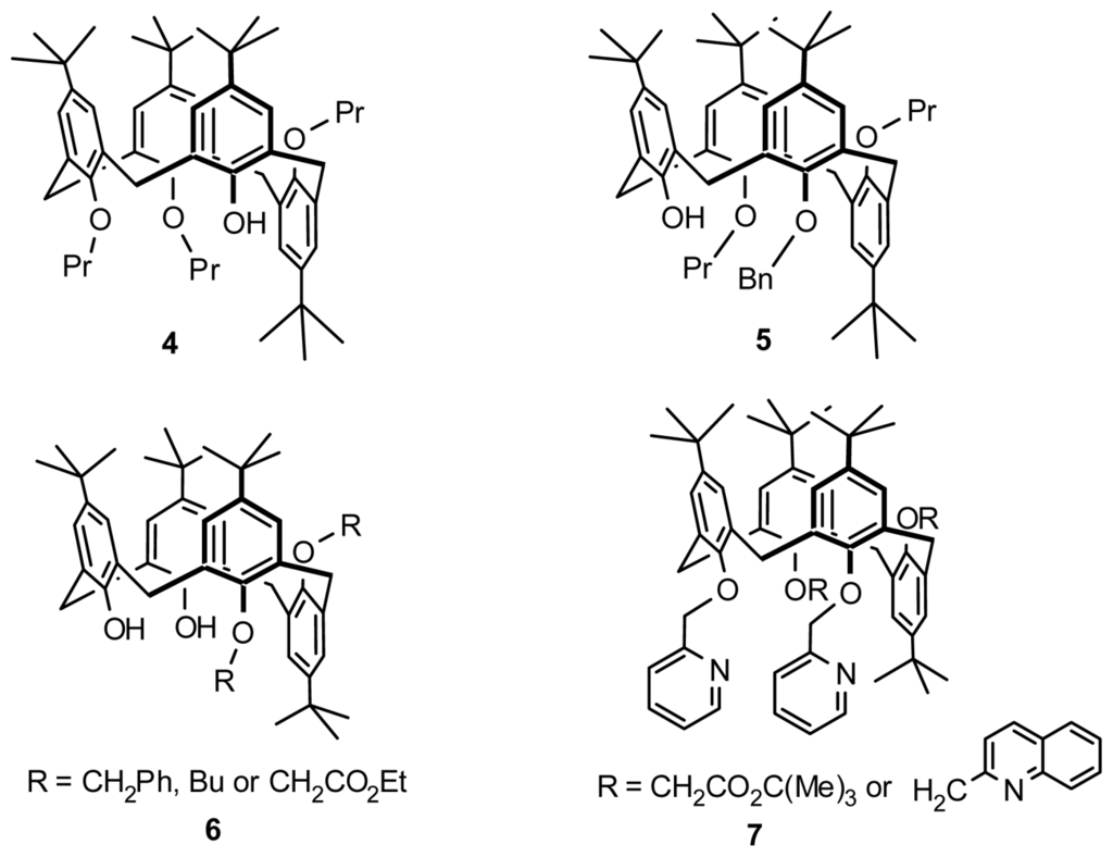 In addition to the tri-O-substituted inherently chiral calix[4]arene in partial cone conformation above, Narumi and Miyano first obtained a di-O-substituted inherently chiral calix[4]arene in partial cone conformation. Proximally O,O′-disiloxane-bridged calix[4]arene was treated with benzyl bromide and desilylated to yield anti-O,O′-dibenzylcalix[4]arene 6 (Figure 4) [22]. A tetra-O-alkylated inherently chiral calix[4]arene in partial cone conformation 7 (Figure 4) reported by Pappalardo was synthesized from exhaustive alkylation of syn-proximal bis[(2-pyridylmethyl)oxy]calix[4]arene with t-butyl bromoacetate or 2-(chloromethyl)quinoline hydrochloride [23].