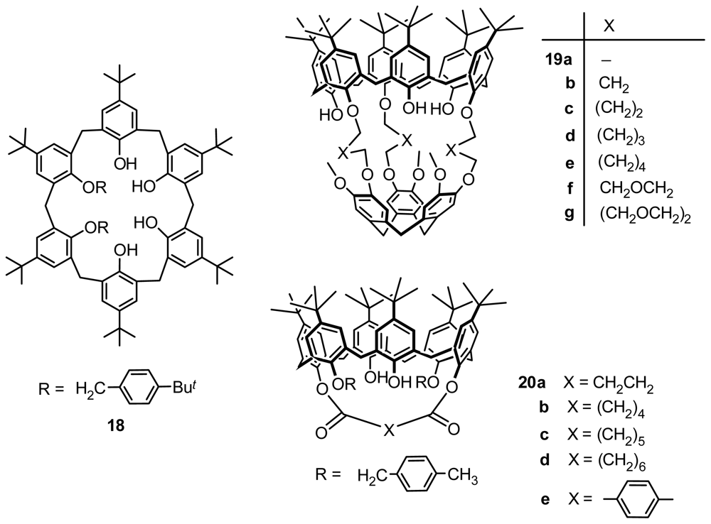 Asymmetrical O-substitution on the lower rim is also applied to prepare inherently chiral calix[6]arene. Inherently chiral anti isomers of l,2-bis-(p-tert-butylbenzyl) ether of p-tertbutylcalix[ 6]arene 18 (Figure 7) was obtained by Neri by heating a tetrachloroethylene solution of its syn isomer, which is a mixture of various conformers of the same class in a fast exchange regime at room temperature [33]. A type of inherently chiral cryptocalix[6]arenes 19a–g (Figure 7) with C3 symmetry was first synthesized by Reinhoudt by covalent three-point linking of p-tert-butylcalix[6]arene to a cyclotriveratrylene [34]. Moreover, Gutsche designed 1,4-ditolyl ether of diester-bridged p-tert-butylcalix[6]arenes 20a–e (Figure 7) synthesized from p-tert-butylcalix[6]arene 1,4-ditolyl ether and appropriate diacid chloride, which were inherently chiral with C2 symmetry [35].