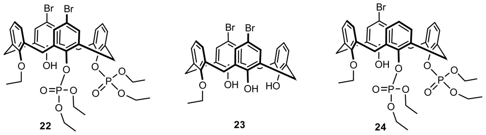 Based on O,O′-phosphorotropic rearrangements of 1,3-distally disubstituted calix[4]arenes into 1,2-proximal isomers, regioselective bromination of the upper rim, and hydrolytic removal of the phosphoryl or benzoyl group from the lower rim, Kalchenko first synthesized three types of inherently chiral calix[4]arenes 22–24 (Figure 9) in cone conformation with asymmetrical superposition of ethyl, diethoxyphosphoryl groups on the lower rim, and bromine atoms on the upper rim [25].