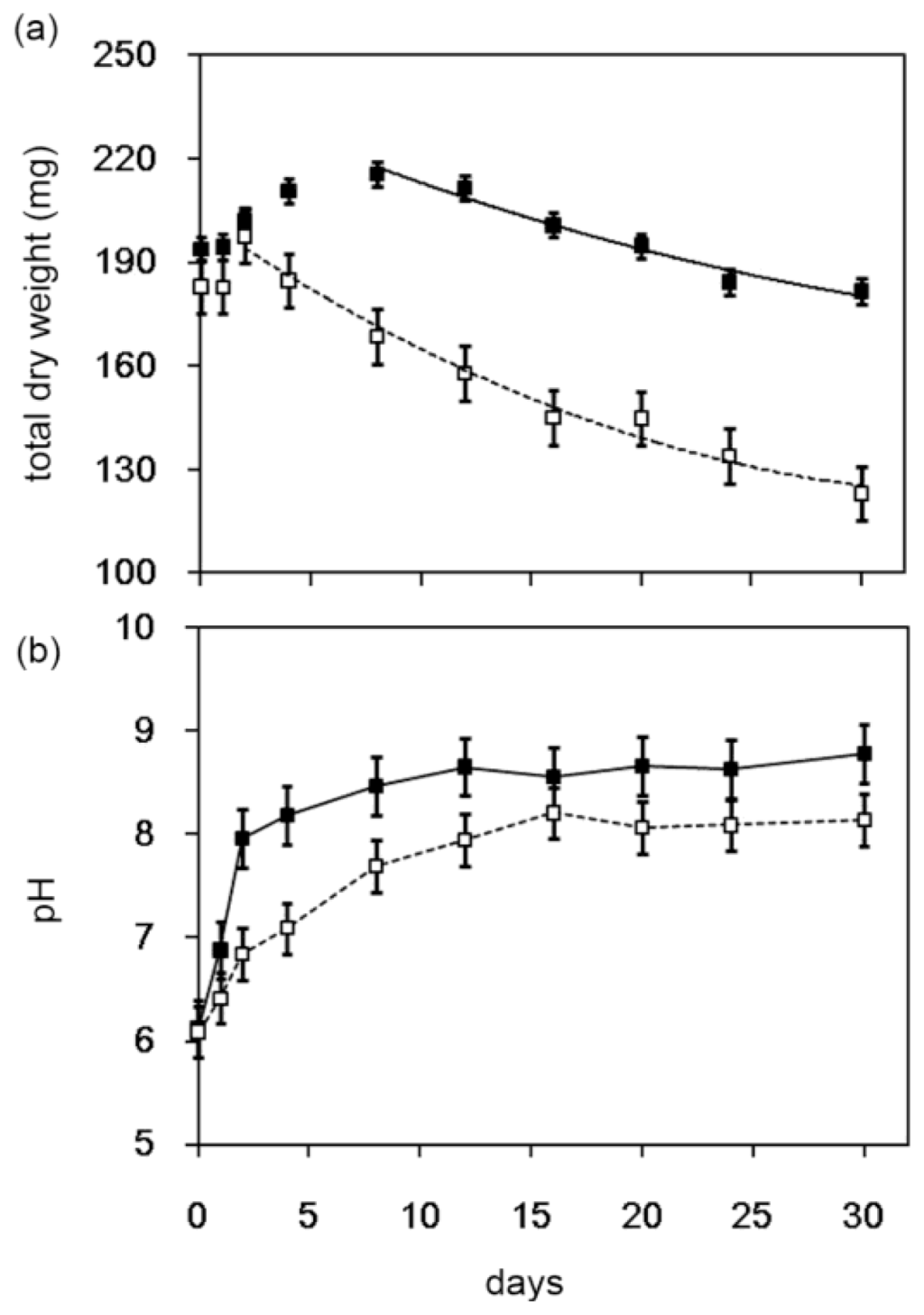 (a) Chitin powder degradation test (30 days). The dry-weight (mg) of the culture was measured after inoculation. Decrease of the total dry weight for samples with (solid square) or without (open square) gelatin (1 mg/mL); (b) Change of pH value of the culture media during the chitin powder degradation test. Samples cultured with or without gelatin (1 mg/mL) are shown by solid squares and open squares, respectively.