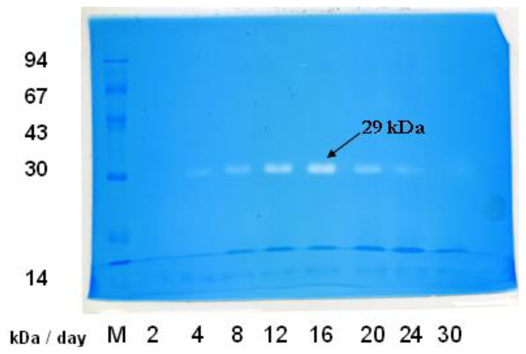 Culture media from the chitin powder degradation experiments were also collected by removal of the cells and other insoluble substances, and subjected to in-gel chitinolytic activity staining using a previously published method [3]. The degradation of embedded glycol chitosan (Sigma-Aldrich, MO, U.S.) resulted in clear zones visualized by Coomassie Brilliant Blue G 250 (Figure 2). A clear zone corresponding to a MW of about 29 kDa was observed and appeared to be expressed in highest yield at day 12–16. This is consistent to the specific chitinolytic activity of the culture medium measured by reducing end production, which is also highest at day 12–16.