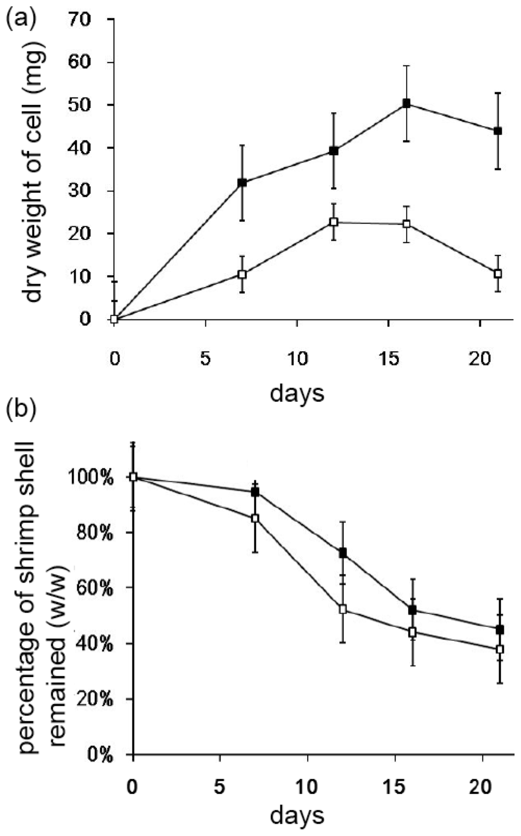 (a) Growth of Streptomyces sp. TH-11 on media containing ground shrimp shells; (b) Dissipation of shrimp shells monitored by direct weight measurement. Samples cultured with or without gelatin (1 mg/mL) are shown by solid squares and open squares, respectively.