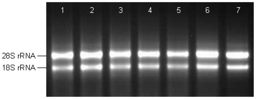 (1.1%) Agarose gel electrophoresis of total RNA. Total RNA extracted from Fusarium-infected wheat spikes was fractioned. Lanes 1, 2, 3, 4, 5, 6, and 7 represent samples collected 6, 12, 24, 36, 48, 72hr, and 6 days after-inoculation, respectively. One microliter of RNA was loaded for each sample.