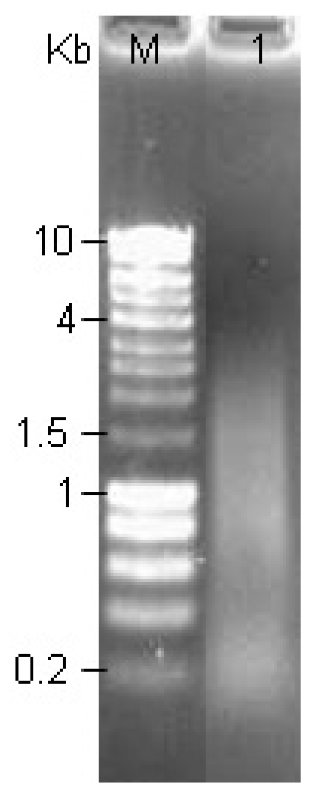 A 1.1% agarose gel electrophoresis of Poly(A)+ RNA. A uniform smearing pattern of the Poly(A)+ RNA indicates a high mRNA quality purified from total RNA. M: RNA ladder; Line 1: Poly(A)+ RNA (0.2 μg).
