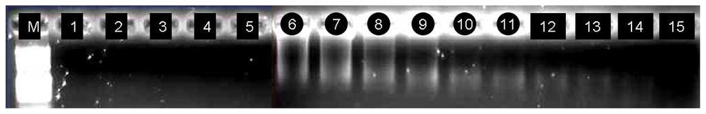 A 1.1% agarose gel electrophoresis of size-fractionated cDNA for removal of small oligonucleotides. Single-drop fractions (15 fractions, 35 μL each) were collected in separated tubes, and 3 μL of each fraction was electrophorised on 1.1% agarose gel at 150 V for 10 min. The lightest lanes (circled numbers 6–11) indicating cDNA peaks were collected for ligationstep. M: HyberLadder marker; Lanes 1–15 are cDNA size-fractionated samples.