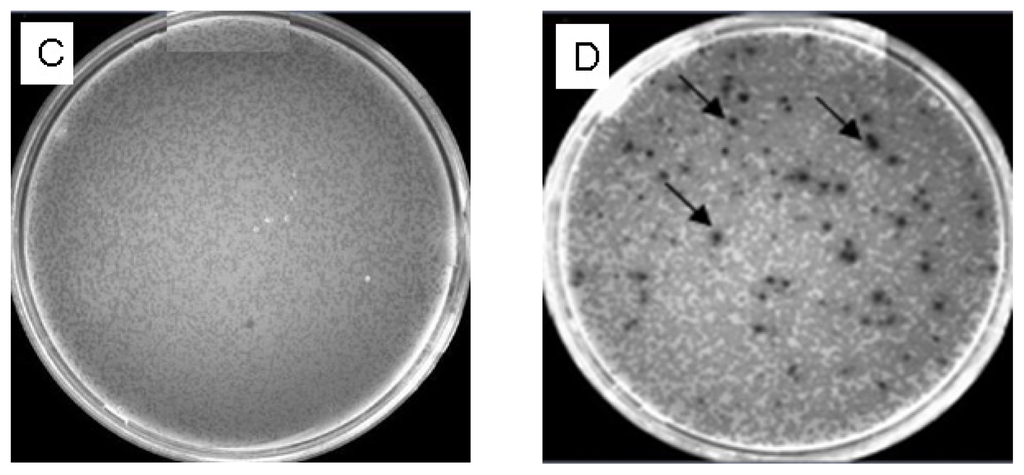 (A) The titer of unamplified library. (B) Blue and white screening of the unamplified library. Arrows indicate blue plaques. The two plates (A, B) were inoculated with a 10-fold dilution of packaged phage. Plaques were approximately 1 mm in diameter. (C) The titer of amplified library. (D) Blue and white screening of the amplified library. Arrows indicate blue plaques. The two plates (C, D) were inoculated with a 1 × 104 dilution of phage lysate. Bacteriophage: λ lcI857 Sam7. Host: Escherichia coli LE392MP.