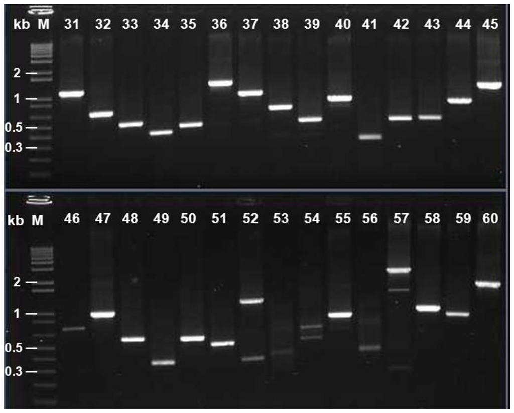 A 1.1% agrose gel electrophoresis of PCR products of cDNA inserts selected randomly (165 plaques) from the amplified cDNA library. Lane M: 1 kb Plus DNA marker (Invitrogen); 31–60: A part of plaques selected randomly and insert-amplified by PCR.