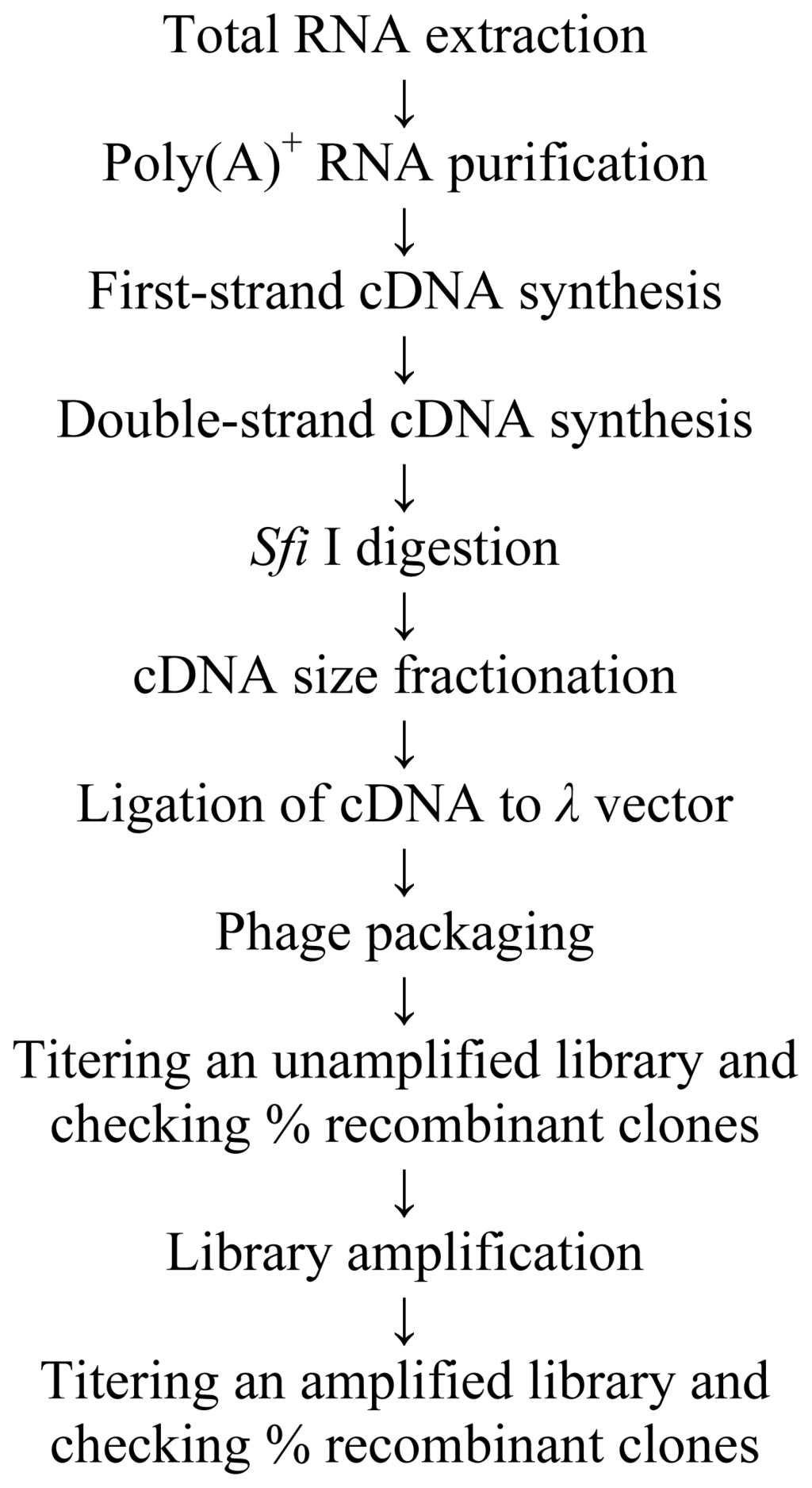 cDNA and λTriplEx2 vector (Clontech, USA) were ligated based on the concentration ratio (1/10: cDNA/vector); the reaction mixture of cDNA, λTriplEx2 vector, ligation buffer, T4 DNA ligase, ATP and deionized H2O was incubated at 16 °C overnight.