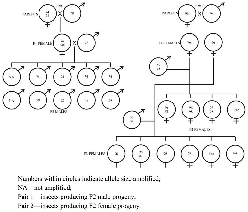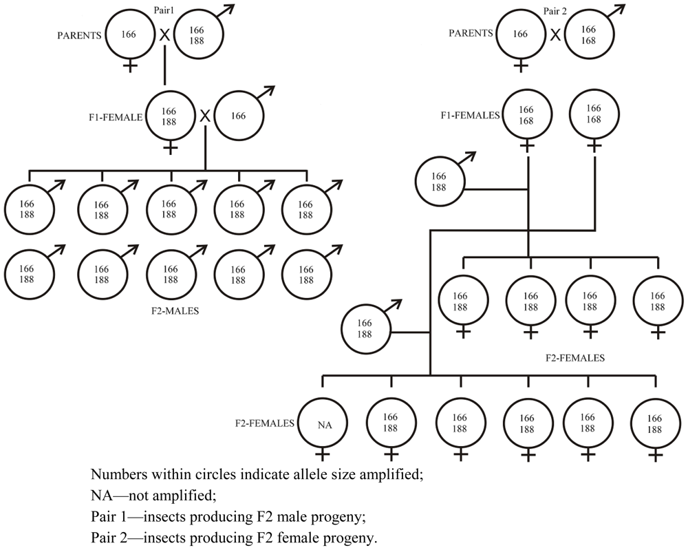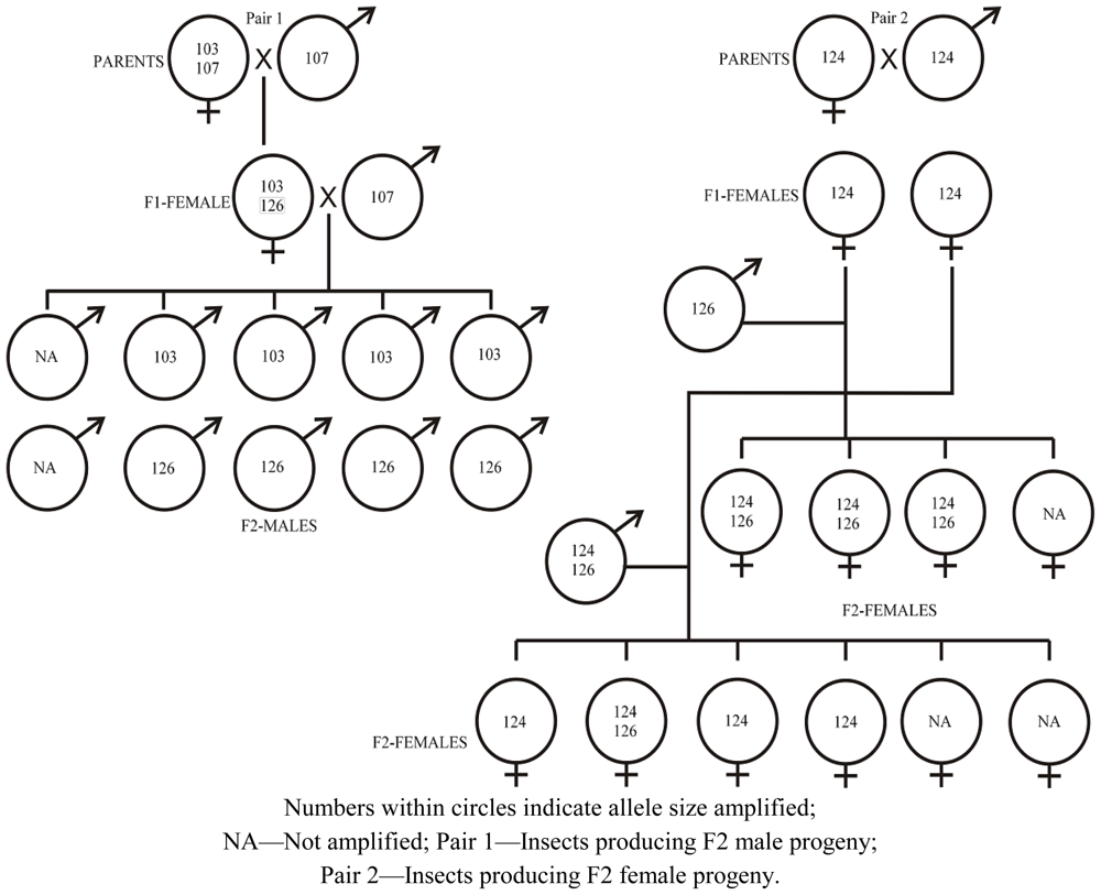 Three markers (Oosat55, Oosat59 and Oosat43) were selected based on the observed polymorphism between males and females. These markers were selected for inheritance study in the iso-female families of GMB4M. Pedigreed crosses were made to obtain F1 and F2 progeny while insects after mating, were preserved, for genotyping with these markers. At least two parental pairs were used to generate F1 females that produced male and female progeny.