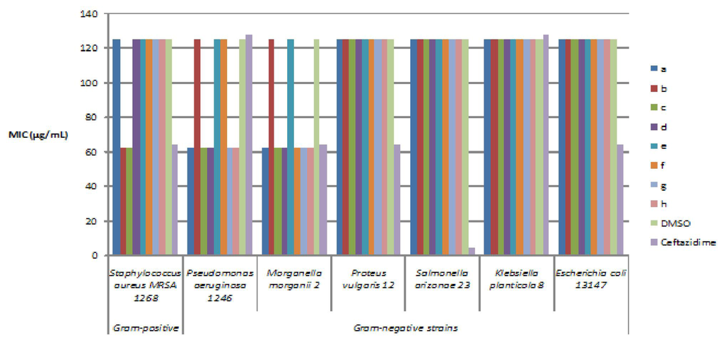 Although the differences between DMSO and the tested compounds did not exceed one dilution, it must be noticed that in some cases, our compounds were more active than ceftazidime. The relatively high MIC values could be due, on the other hand, to the fact that the bacterial strains chosen to be tested were of clinical origin and resistant to antibiotics.