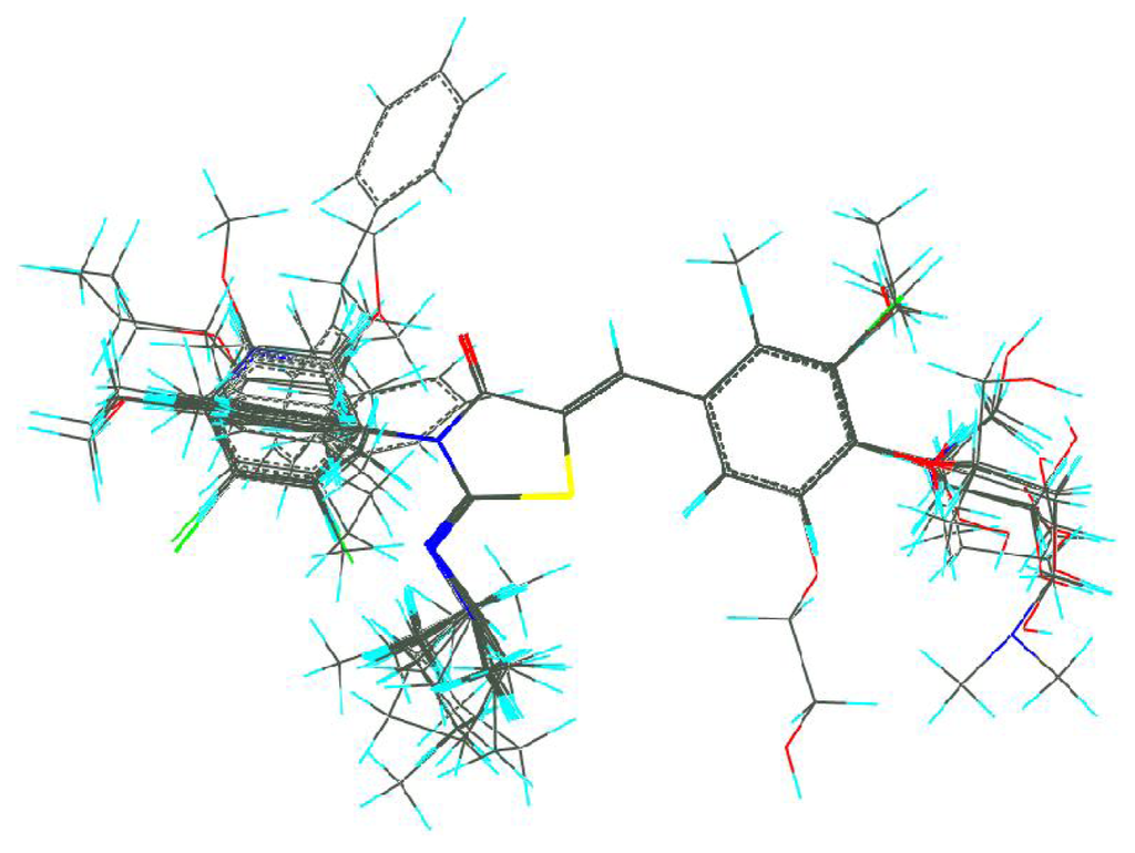 A good alignment is the most important element for CoMFA and CoMSIA analysis although probe atom type, lattice shifting step size and over all orientation of the aligned compounds may have a bearing on their results [24]. The quality and the predictive ability of the model are directly dependent on the alignment rules. Once the active conformation was determined by energy minimization using Powell method and Tripos standard force field [25] with a distance-dependent dielectric function, the alignment was performed based on some rules such as substructure overlap, pharmacophore overlap and docking [26]. In order to produce a more robust CoMFA and CoMSIA models with a good cross-validated r2 value, the 5-benzylidenylthizaolindin-4-one with structural rigidity was selected as the common substructure to overlap and to align all of the molecules and the most active compound 65 was used as the alignment template. Alignment of all compounds was shown in Figure 1. It can be seen that all the compounds studied have similar active conformations.