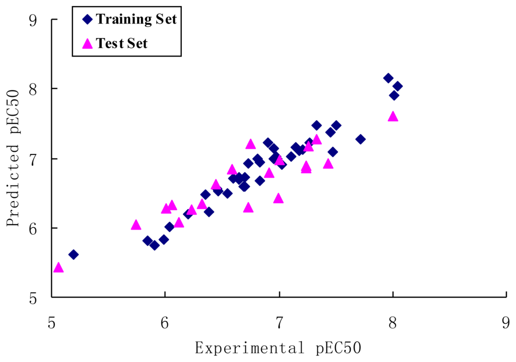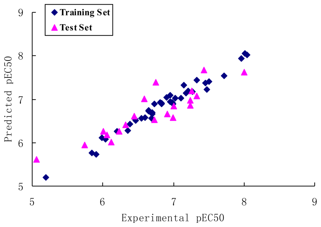 Graph of experimental versus predicted pEC50 of the training set and the test set using the CoMFA model.