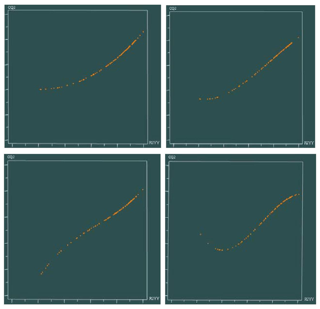 Here, y′ indicates the perturbed (scrambled) responses and the statistic r2 yy′ expresses the degree of correlation between the perturbed responses and the original ones. The Q2 statistic obtained in this way is very conservative, in that it is necessarily reduced by the level of noise introduced to remove redundancy, so a value as low as 0.35 will signify that the original, unperturbed model is robust [33]. The dq2/dr2 yy′ means what extent the model changes with small changes to the dependent variable. In a stable model, changing proportionally with small changes in underlying data, has a slope near unity while unstable models change greatly with small changes in underlying response values and its effective slope is generally greater than 1.2. This method was employed to verify the optimal number of components and test the cross-validation against the possibility of such a redundancy in our training set [37].