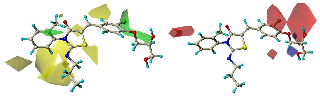 The results of 3D-QSAR models are presented in the contour coefficient maps as shown in Figure 5. The CoMFA steric contour map of the most active compound 60 shows a large green polyhedron around 3, 4-positions of 5-benzylidene and a small green one locates near 2-position of N3-phenyl ring, suggesting that bulky substituents are preferred in these regions. Large yellow polyhedra at 2-position of 5-benzylidene and around 2-substituent at the iminothiazolidinone scaffold indicate that bulks are disfavored here. These may be the reason why compound 60 with a chlorine atom and a hydroxylethyloxyl substitution at 3- and 4-positions of 5-benzylidene respectively, a methyl group linking to 2-position of 3-phenyl ring substituted at iminothiazolidinone ring, and no substitutions at 2-position of 5-benzylidene ring, showed the most active. Similar to compound 60, compounds 58, 59, 61 displayed almost identical potency. On the other hand, compound 56, with the reverse of substitution at each corresponding position, showed very low activity. The contour maps also show that compounds 18, 25–27, 40 exhibited much higher potency than 19, 30–32, 46 correspondingly. At the same time, the steric contour illustrated a weak trend for a reducing chain length to steadily improve the compound’s potency. For example, the activity of compounds 12, 11, 10, 9 was decreased in turn.