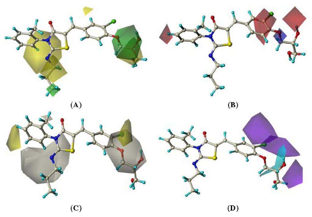 CoMSIA fields. The CoMSIA fields from model 6 are shown with active compound 60. (A) Steric fields, green indicates steric bulk favored, yellow indicates bulk disfavored; (B) Electrostatic fields, blue indicates electropositive groups favored, red fields indicate electronegative groups favored; (C) Hydrophobic fields, yellow indicates favored, gray disfavored; (D) H-bond donor field, cyan indicates donor favored, purple disfavored.