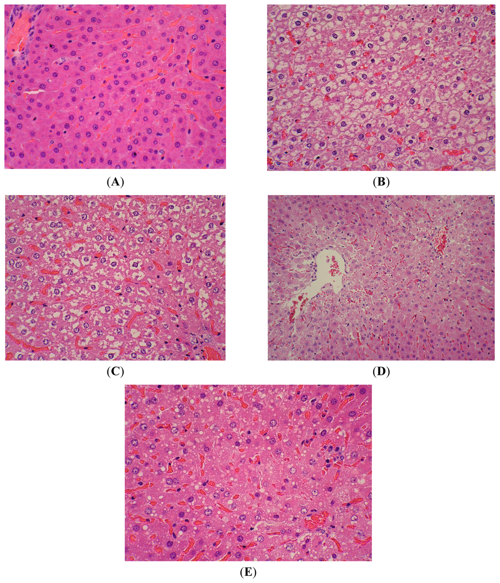 Histological Analysis of the Livers after CCl4 Administration. Typical images were chosen from the different experimental groups (original magnification 400×). (A) Control group; (B) vehicle-treated CCl4 group; (C) CCl4 and LE (150 mg/kg)-treated group; (D) CCl4 and LE (300 mg/kg)-treated group And (E) CCl4 and bifendate (100 mg/kg)-treated group.