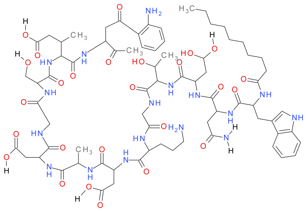 The structure of Daptomycin. Adapted from Steenbergen et al. 2005 [113].