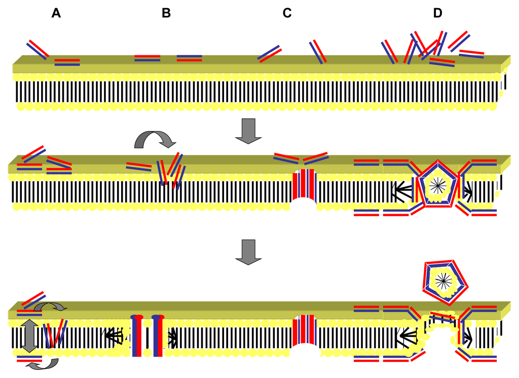 The toroidal pore model involves the peptide inserting perpendicular into the cell membrane via electrostatic interactions between the hydrophilic regions of the peptide and the phospholipid head of the bilayer. Hydrophobic regions of the peptide bend the lipid monolayers forming a central water core lined by lipid head groups and inserted peptides [148]. In doing this the membrane bends inwards such that the bilayer lines the channel as well as the peptides. A toroidal pore is thus formed by positive curvature, allowing entry of further antimicrobial peptide [149]. In the aggregate model a similar process occurs to that of the toroidal pore model. However, peptides do not adopt any specific orientation upon insertion into the membrane but cover the membrane as an aggregate of peptide and lipid micelles [150]. Channels that do form vary greatly, so much that partial membrane insertion may lead to the formation of negative curvature and peptide aggregation within the bilayer [151].