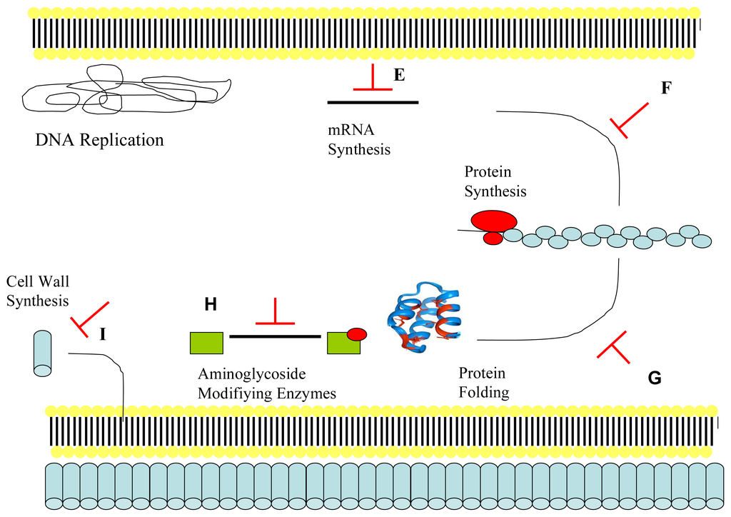 The intracellular action of some antimicrobial peptides (E−I). (E) Dermaseptin, buforin-II and pleurocidin are antimicrobial peptides that have been shown to inhibit both DNA and RNA synthesis at MIC values [188]. Dermaseptin inhibits RNA synthesis in bacteria at MIC concentration or higher within 5 minutes, with lack of bactericidal action within 30 minutes in Escherichia coli evidence of a mainly intracellular action [189]. Buforin-II contains a single proline residue within its primary structure that allows translocation across cell membranes without membrane destruction, with binding to nucleic acids resulting in cell death [170,190]; (F) PR-39 and indolicidin have been shown to inhibit the rate of protein synthesis and is therefore a plausible target for antimicrobial peptides [13,180,191]; (G) Pyrrhocoricin and drosocin act one step later than the molecules of part E (dermaseptin, buforin-II and pleurocidin) and have been shown to reduce enzymatic activity via inhibition of ATPase activity of the heat-shock protein DnaK, an enzyme involved in chaperone-assisted protein folding [192–194]. Otvos and colleagues formed a chimeric dimer, with newly formed activity against Staphylococcus aureus and increased activity against previously sensitive Escherichia coli, by synthesizing a molecule that possessed pyrrhocoricin’s DnaK binding domain and drosocin’s high membrane permeating ability [195]; (H) Antimicrobial peptides may also inhibit resistance mechanisms linked to bacterial pathogenesis for example enzymes with anionic binding site pockets linked to the modification of aminoglycoside antibiotics [171]; (I) Lantibiotics such as mersacidin and nisin target the formation of structural components of the cell wall, specifically the transglycosylation of lipid II, necessary for the synthesis of peptidoglycan [196,197]. Adapted from Jenssen, Hamill and Hancock 2006 [147].