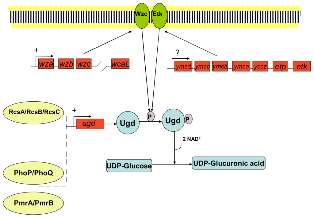 The synthesis of Undecaprenyl phosphate-glucuronic acid via quorum sensing systems. The two component quorum sensing systems PhoP/PhoQ and PmrA/PmrB; or the RcsA/RcsB/RcsC system alone allow the expression of genes (ugd) involved in the intracellular synthesis of the 4-amino-4-deoxy-L-arabinose precursor: Undecaprenyl phosphate-glucuronic acid. Both scenarios involve the phosphorylation of the protein Ugd by the membrane bound autophosphorylated protein-tyrosine kinase Wzc and/or Etk. Etk and Wzc are a BY-kinase (a newly defined group of enzymes involved in protein-tyrosine phosphorylation) of Escherichia coli and are involved in the production of the group IV capsule surrounding the cell membrane [209]. The wca operon is upregulated by the RcsA/RcsB/RcsC system and consists of 19 genes with the third gene in order of transcription being the wzc gene that has been shown to encode a membrane bound autophosphorylated protein-tyrosine kinase Wzc [210]. Etk is coded for by the etk gene present on the ymc operon of some pathogenic strains of Escherichia coli [211]. The mechanism of the ymc operon is itself unknown, although it could possibly be a promoter of etk expression. Key: UDP: Undecaprenyl phosphate. (Adapted from Lacour, 2008 [212])