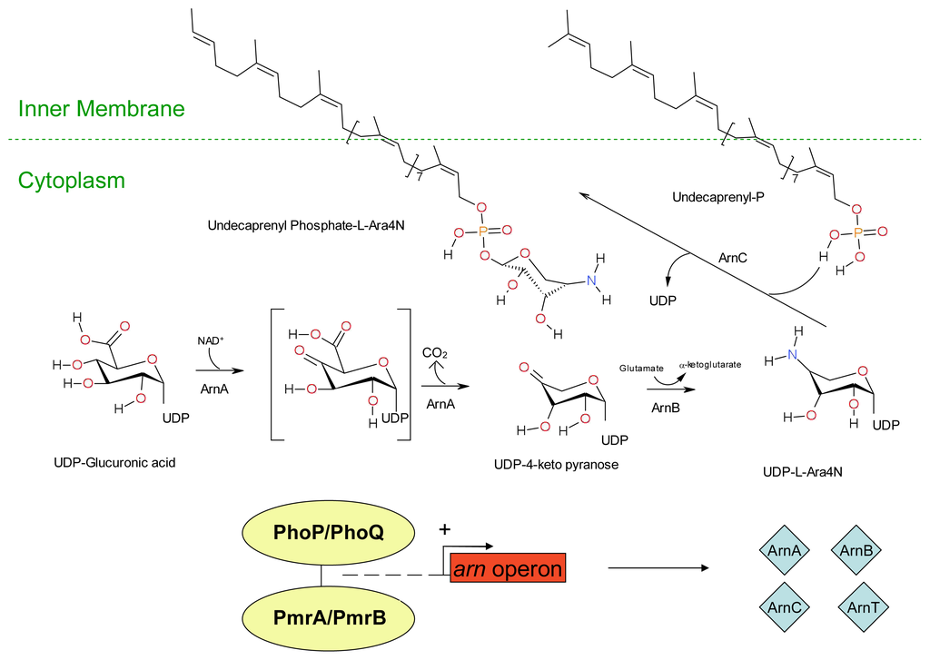 The synthesis of Undecaprenyl Phosphate-α-4-amino-4-deoxy-L-arabinose from Undecaprenyl-Glucuronic acid. The enzymes ArnA, ArnB, ArnC and ArnT are produced by transcription of the arn operon which is upregulated by the RcsA/RcsB/RcsC and PmrA/PmrB quorum sensing systems. The enzyme ArnA catalyses the oxidative decarboxylation of Undecaprenyl -glucuronic acid, thus forming an Undecaprenyl -4-keto-pyranose intermediate. ArnC catalyzes the transfer of the 4-amino-4-deoxy-L-arabinose moiety to Undecaprenyl phosphate in the inner membrane, forming the Undecaprenyl phosphate-α-4-amino-4-deoxy-L-arabinose. Key: UDP: Undecaprenyl phosphate. (Adapted from Lacour, S. 2008 [212]).