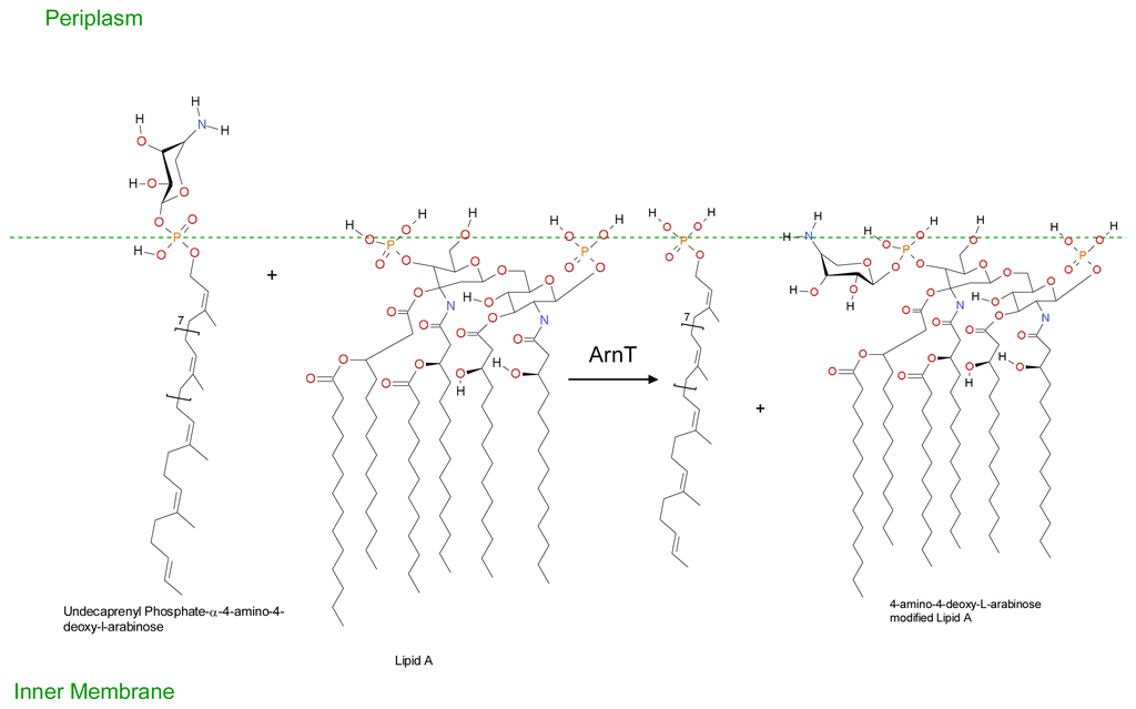 The transfer of 4-amino-4-deoxy-L-arabinose moiety to Lipid A. Translocation to the outer surface of the inner membrane occurs via an unknown mechanism. ArnT transfer the 4-amino-4-deoxy-L-arabinose moiety from Undecaprenyl phosphate-α-4-amino-4-deoxy-L-arabinose to Lipid A, thereby reducing the affinity of Lipid A for polymyxin and other cationic antimicrobial peptides. (Adapted from Lacour, S. 2008 [212]).