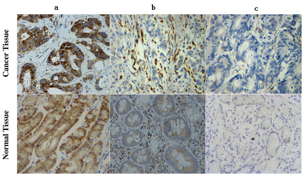 Immunohistochemical analysis of elongation factor Tu (EF-Tu) expression in gastric adenocarcinomas. (a) High complete cytoplasmic staining observed in >25% of tumor cells; (b) faint/barely perceptible cytoplasmic staining detected in >25% of tumor cells; (c) No staining observed.