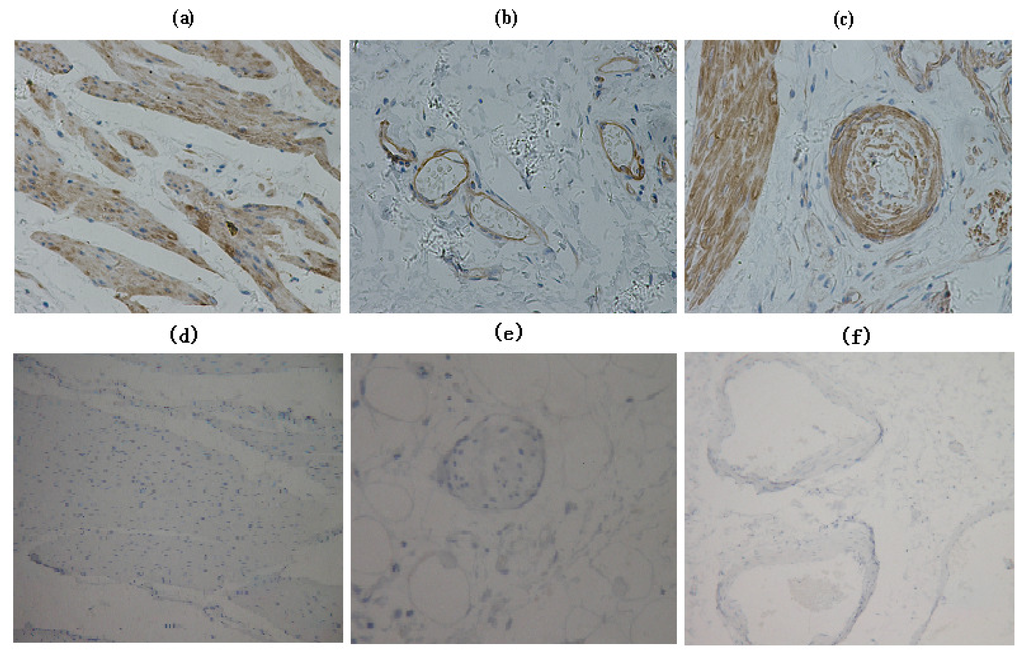 Immunohistochemical analysis of EF-Tu expression in interstitial tissue: (a) Smooth muscle; (b) venous endothelial cells; (c) artery endothelial cells, showed high EF-Tu expression. Immunohistochemical analysis of EF-Tu negative control: (d) Smooth muscle; (e) venous endothelial cells; (f) artery endothelial cells.