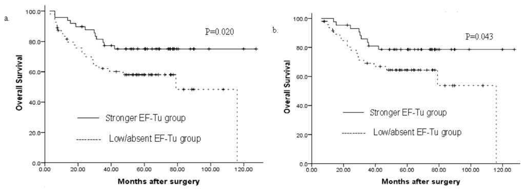 (a) The mean overall survival time for the negative/weak EF-Tu expression group was 71.6 months, and for the high EF-Tu expression group was 101.7 months (P = 0.020); (b) In R0 (radical operation) gastric cancer, the mean overall survival time for the negative/weak EF-Tu expression group was 79.0 months and for the high EF-Tu expression group was106.2 months (P = 0.043).