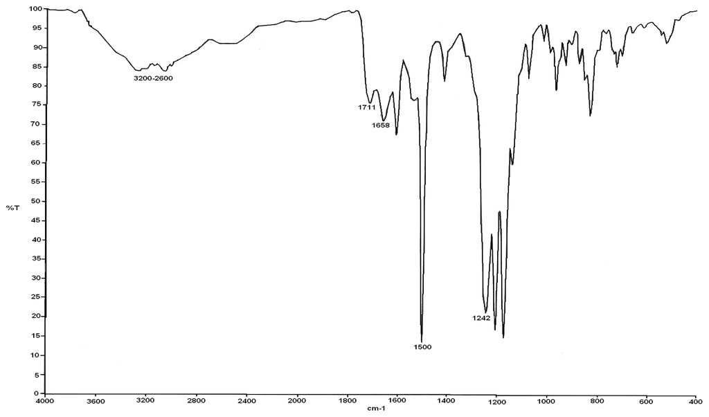Polymers obtained were characterized by FTIR. Figure 1 presents the FTIR spectra of the polymer M504. According to this result, the formation of the poly(amic acid) structure under our experimental conditions was confirmed by the presence of infrared (IR) absorption bands located at: 3500–2500 cm−1 which indicates the existence of -OH group (–COOH), and 1711 cm−1 carbonyl group C=O (–COOH stretching vibration), 1658 cm−1 carbonyl group C=O (–CONH stretching vibration), 1539 cm−1 (N–H bending), 1500 cm−1 aromatic ring (C–C stretching), 1242 cm−1 indicates the existence of C–N bonds.