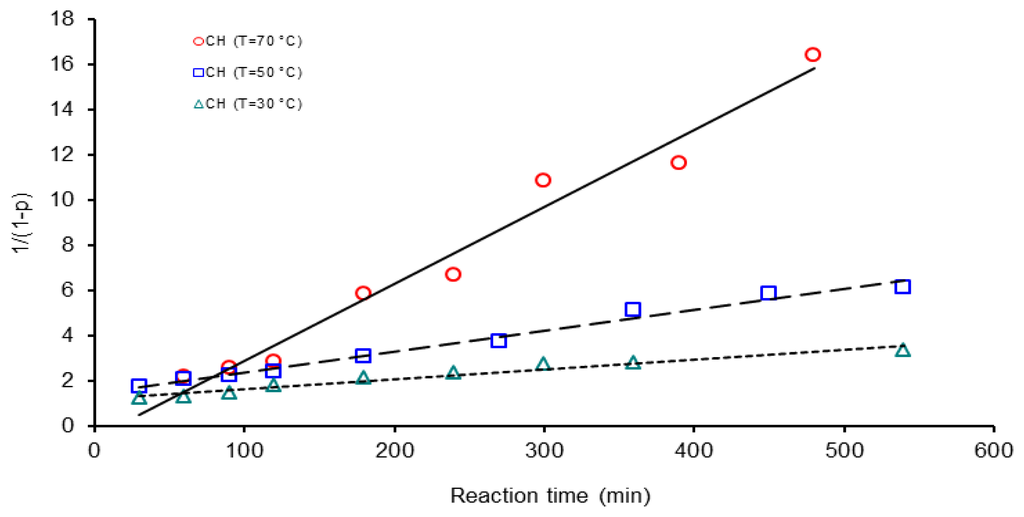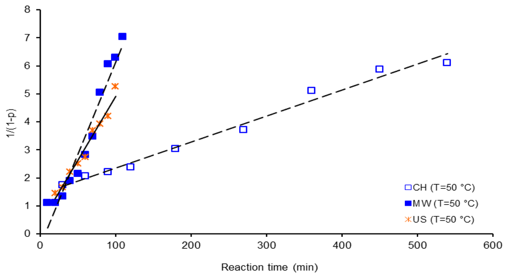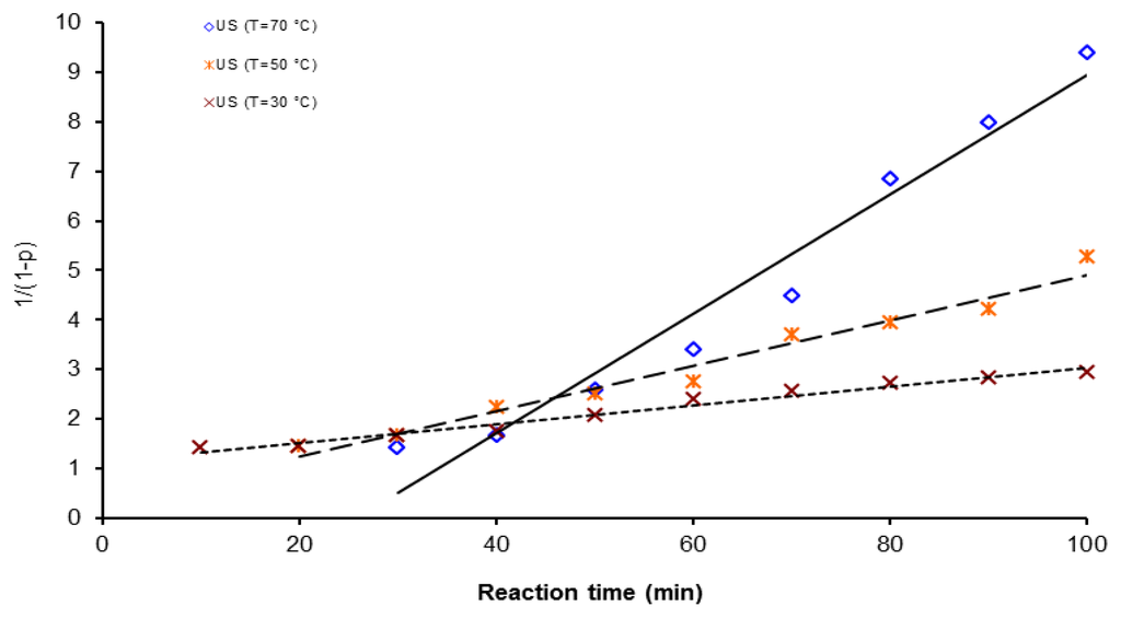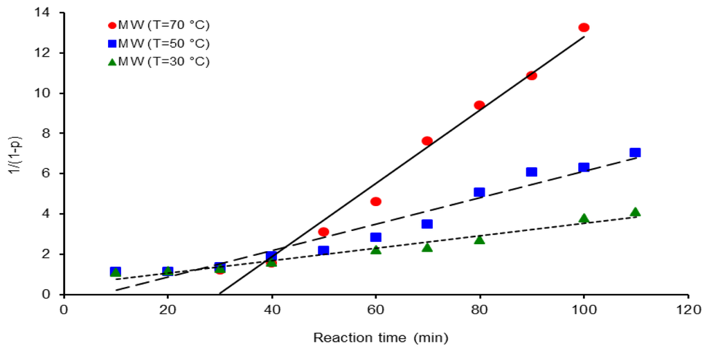Second order kinetic plots of reaction time vs. 1/(1 − p) for polycondensation reactions at three different temperatures are shown in Figures 8–10. All the kinetic data are fit to this second order kinetic equation. Calculated correlation coefficients values are always higher than 0.9586 and the best values obtained were: 0.9838 for a reaction activated by conventional heating at 50 °C, 0.9791 for microwave assisted polymerization at 70 °C and 0.9758 for the ultrasound assisted experiments at 30 °C.