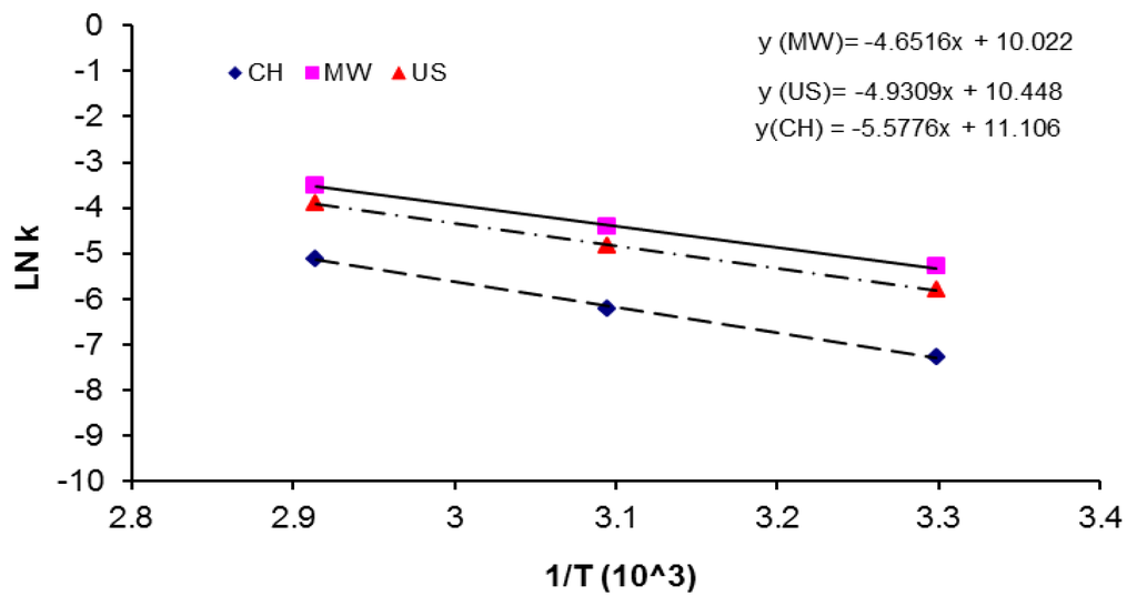 For comparison purposes activation energies (ΔGa), reaction rate constants, pre-exponential factors of the Arrhenius equation for the synthesis of PAA by the three activation methods were calculated. The rate constants were plotted, as shown in Figure 12. The calculated activation energies ΔGa, differences among those calculated values (Δ) and pre-exponential factors (A) for the three activation methods are displayed in Table 1. The pre-exponential factors (A) decrease in the following order 6.6 × 104 (CH) > 3.4 × 104 (US) > 2.2 × 104 (MW) for poy(amic acid) synthesis by three activation methods. This observation is in good agreement with the results reported by Lewis [34] who found that pre-exponential factor A for microwave imidization reaction of poly(amic acid) BTDA-DDS was lower than pre-exponential factor calculated when imidization reaction was carried out by thermal treatment. The values of pre-exponential factors were 4.4 × 105 and 3.95 × 1010 for microwave and thermal treatments, respectively.