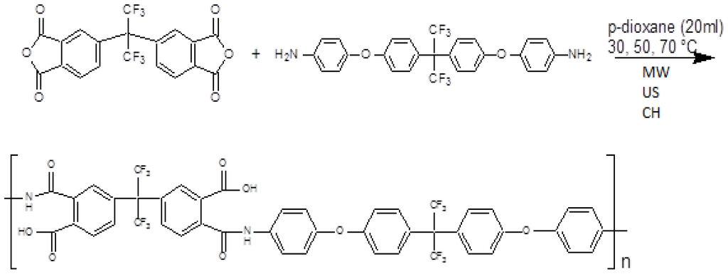 All polymer samples were identified with one letter and two digits, according to the next description: first letter corresponds to the activation method used, in this case conventional heating (CH), microwave irradiation (MW) or ultrasound irradiation (US), the first number corresponds to the temperature selected for reaction activation and a second number corresponds to the polymerization time, in minutes. For example, sample C707, stands for poly(amic acid) (6FDA-BAPHF) synthesized by conventional heating in p-dioxane, at 70 °C and 300 min reaction time.
