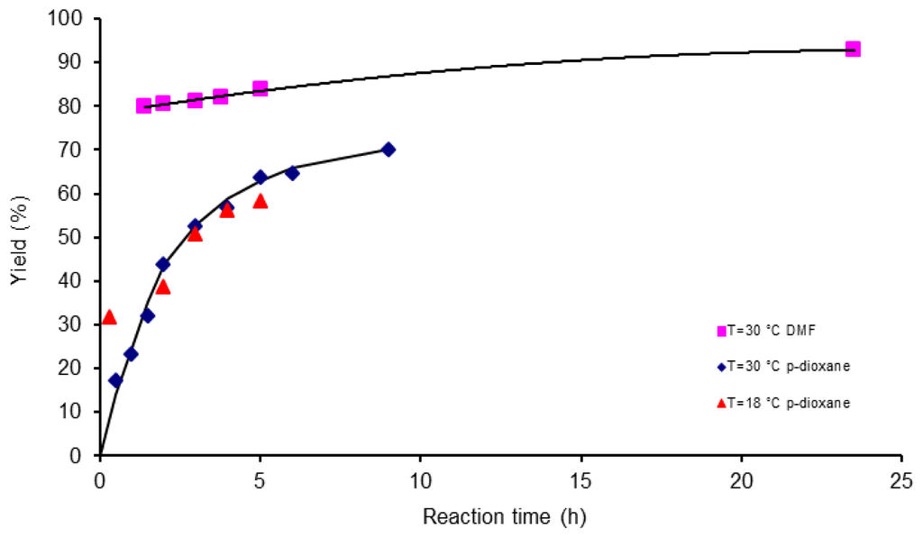 Dependence of yield (%) on the reaction time, 1 mmol of 6FDA-BAPHF, 20 mL of p-dioxane solvent at three temperatures 30 °C, 50 °C and 70 °C; reactions activated by conventional heating.