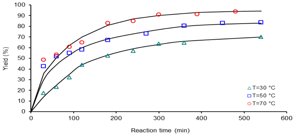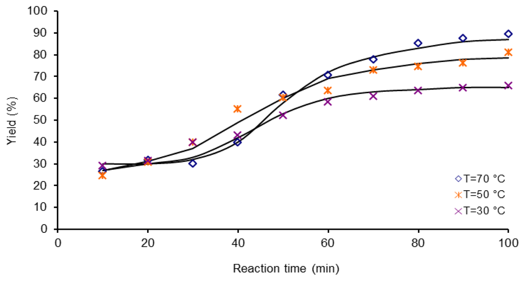 Dependence of yield (%) on the reaction time, 1 mmol of 6FDA-BAPHF, 20 mL of p-dioxane solvent at three temperatures 30 °C, 50 °C and 70 °C, reactions activated by ultrasound.