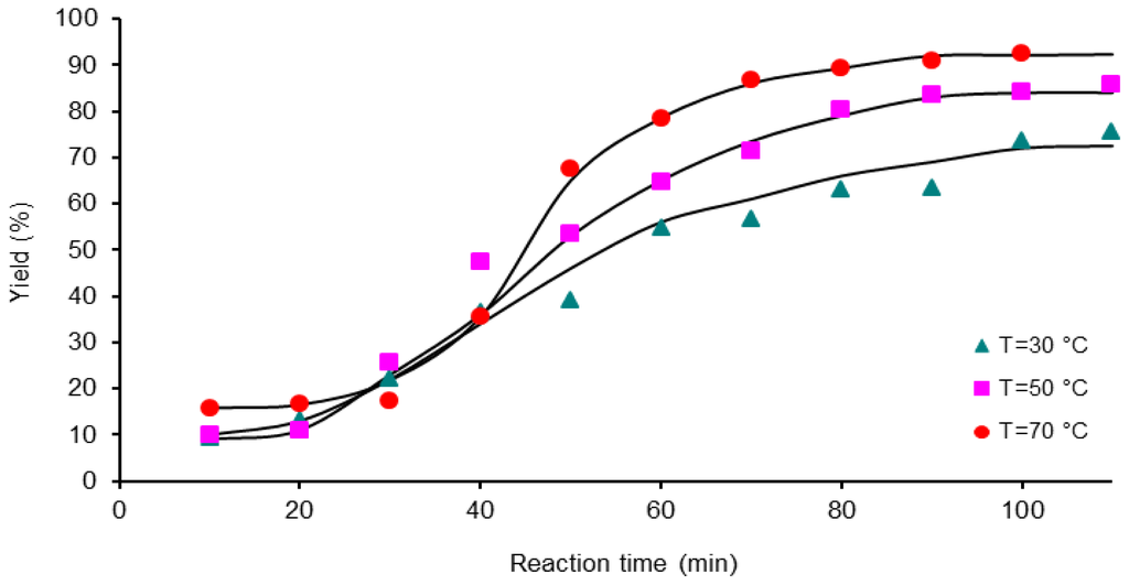 Figure 6 presents kinetic data for three reactions activated by ultrasound. Yields obtained by this activation method are comparable to those obtained by microwave activation experiments. A yield of 87% was reached with 90 min of sonication time, sample U709, if we compare this yield value with the value obtained in the same reaction conditions of temperature (70 °C) and time for sample synthesized by microwave irradiation, sample M709, just a slight difference of 4% was observed. The high yield observed under US conditions can be explained by effective acoustic cavitation, ultrasound comprises sonic waves with frequencies in the range of 0.001 to 107 MHz, when these waves are transmitted through a liquid cavitation takes place [37], it can be defined as the growth and violent collapse of micrometer-sized bubbles. The collapse of these bubbles generates extreme conditions within the core of the bubble, resulting in very high temperatures and pressures, which provide enough energy for polycondensation reaction; very efficient mixing and formation of liquid jets can also occur, due to the rapid motion of fluid [38].