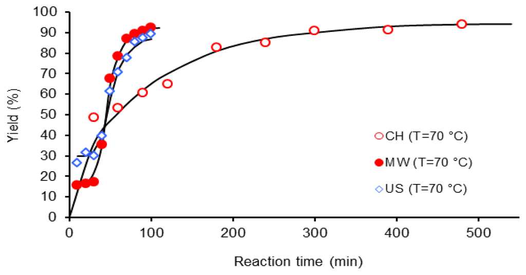 Dependence of yield (%) on the reaction time, 1 mmol of 6FDA-BAPHF, 20 mL of p-dioxane solvent at 70 °C, reactions activated by three methods: MO, US, CH.