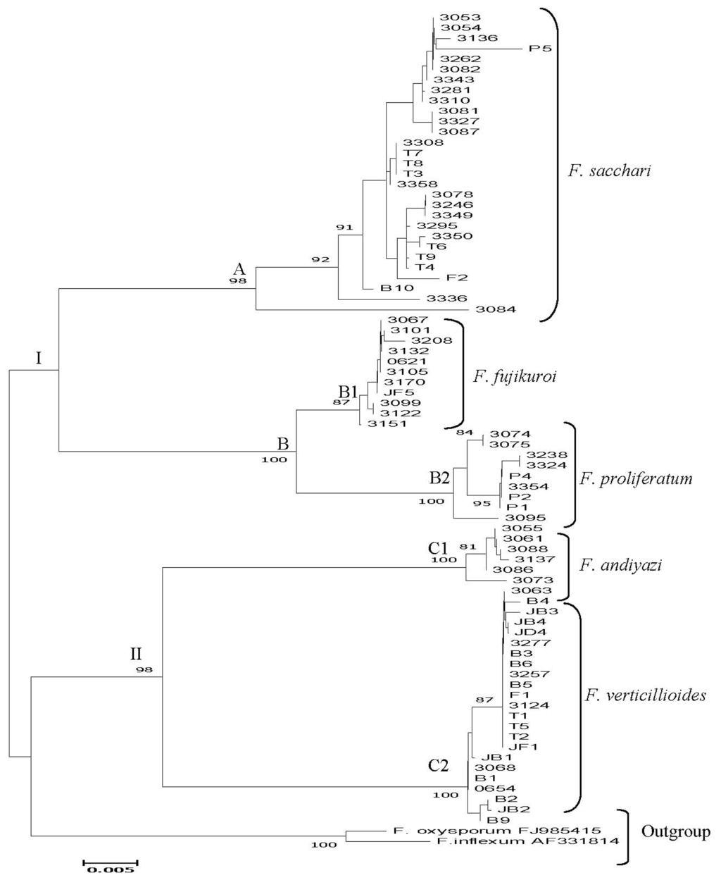 | F2 (M) | Gurun, Kedah | F. subglutinans | F. sacchari (100) | JN675661 |