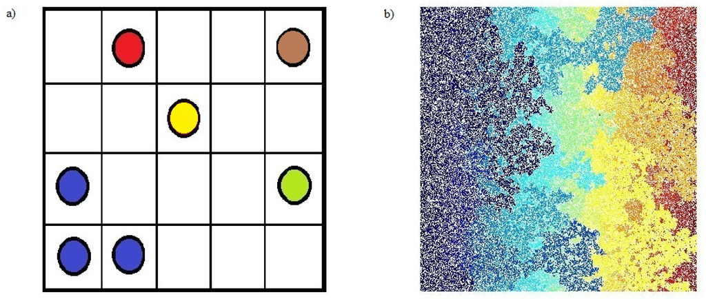 (a) Definition of percolation and clusters. Some squares are occupied by big dots and some are empty. The clusters are groups of neighboring occupied sites; we filled the dots inside a cluster with the same color. (b) Matlab simulation of two-dimensional (site) percolation at the percolation threshold (Pc = 0.5927) on a square lattice of size L = 103. There is a cluster (the dark blue one) spanning the whole system from the bottom to the top of the square.