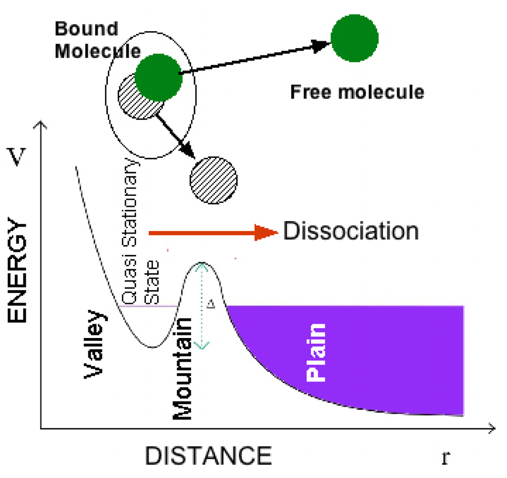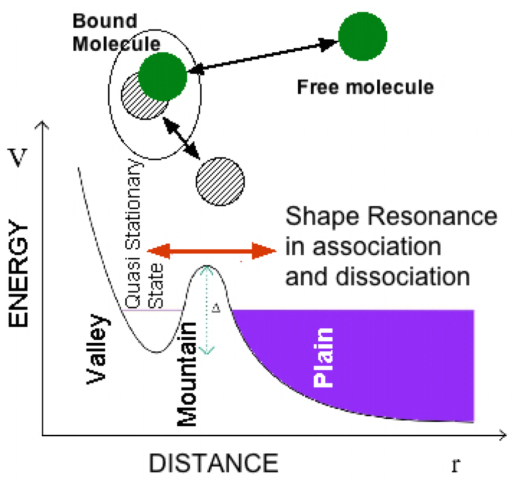 Here we describe the evolution of the scientific idea of shape resonance to understand its relevance. At the time of the foundations of quantum mechanics in 1929 O. K. Rice in California noticed that “when the discrete vibration rotation absorption bands connected with transitions to a certain final electronic state of a molecule overlap the continuous region for the transitions to another final electronic state, some of the discrete bands may be diffuse, i.e., the rotation lines may be broad and blur into each other. The broadness of the lines has previously been assumed to be connected with the short life period of a molecule in a discrete state, when there is the possibility of its making a radiationless transition to a state of dissociation” [57]. He started to use the new formalism of quantum mechanics to explain atomic and molecular collisions and the dissociation of a diatomic molecule induced from a molecular rotational excited state. The molecular dissociation is considered as a manifestation of tunneling from a potential “valley” through a “mountain” into the “plain” (see Figure 4) in his papers [58] written during a visit in the Heisenberg’s institute in Leipzig and he discussed also the analogy with the nuclear alpha decay [59,60].